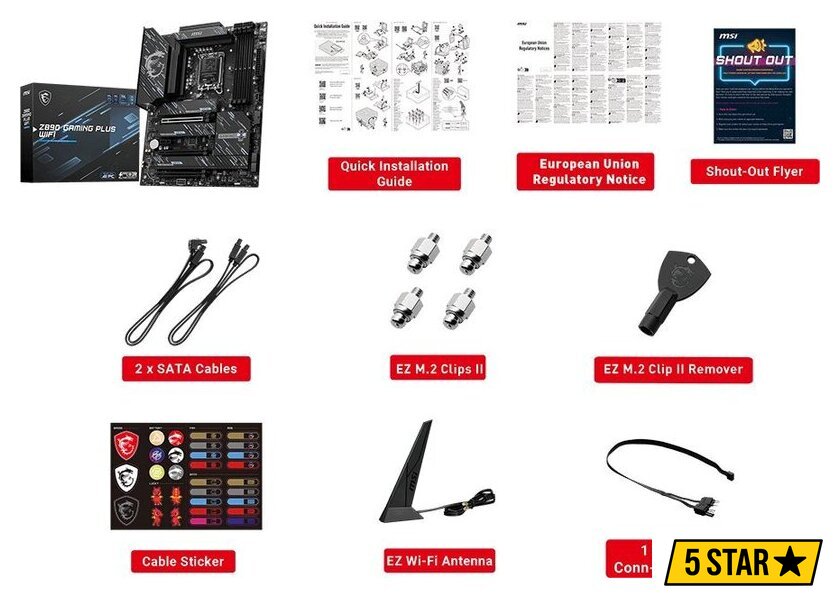 Комплектация | - EZ Wi-Fi антенна - стикеры для кабелей- 2 кабеля SATA- 1EZ - 2EZ кабель - ключ-экстрактор EZ M.2 Clip II - 4 винта со стойкой EZ M.2 Clip II- документация |