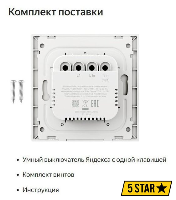 Комплектация | Умный выключатель Яндекса с одной клавишейКомплект винтовИнструкция |
