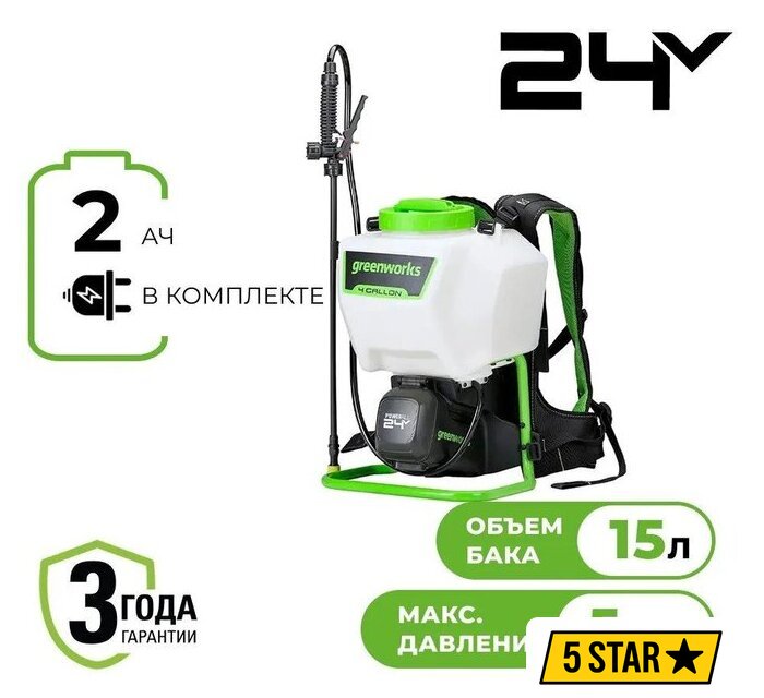 Комплектация | - Опрыскиватель аккумуляторный Greenworks, артикул 5300307- 5 насадок-форсунок:- Насадка ""Двойной конус"";- Насадка ""Конус"";- Насадка ""Лейка"";- Насадка ""Плоская форсунка"";- Насадка регулируемая;- 1хАКБ 2Ач;- 1хзарядное устройство;- Руководство по эксплуатации;- Гарантийный талон. |