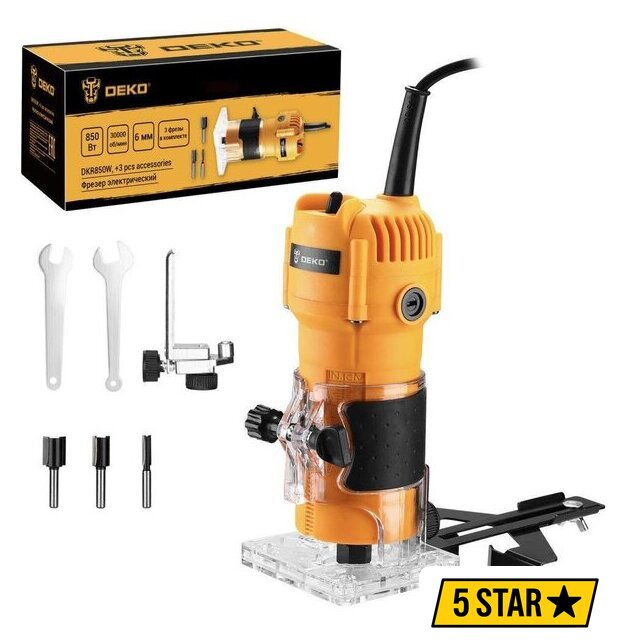Комплектация | - Фрезер - 1 шт.- Параллельный упор (упор, параллельная направляющая, винт и барашковая гайка, кронштейн упора, зажимной винт) - 1 шт.- Гаечный ключ - 2 шт.- Фрезы (D6хH20мм, D12хH20мм, D16хH20мм) - 3 шт.- Угольные щетки - 2 шт.- Руководство по эксплуатации- Коробка |
